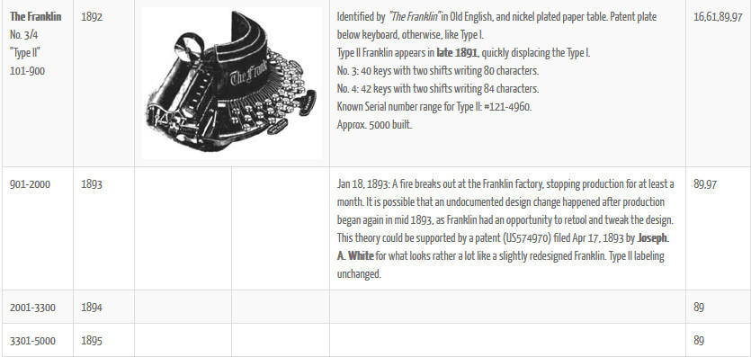 Along with tons of further information the article delivers, combined with the other sources named here, I can now date the year of production of my Franklin to 1893. Since there seems to be an overlapping in model numbers and the oval metal patent plate below the keyboard of my Franklin reads "The Franklin Typewriter Manufacturers" and "Boston, Mass. U.S.A" plus taking into account that it has 40 keys it should be able to distinguish it - by convention - as a Franklin Type II No. 3. It's more delighting with every day it ages...